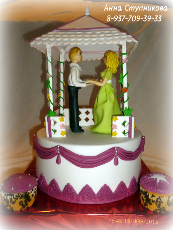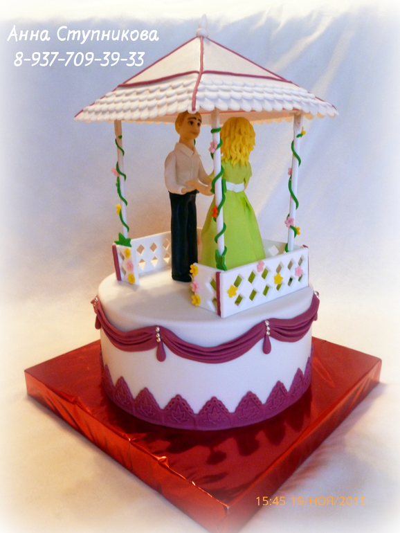 Намучалась я с этой беседкой....получился долгоиграющий торт какой-то. Фигурки слепила заранее, планировались простые, мультяшные, но что-то руки потянулись сделать обычных человечков. Тренируюсь...Беседка казалась мне самой простой....но в итоге вышло наоборот. Сначала хотела из айсинга...сломалась. Высота фигурок вышла больше, чем планировала. Сделала другую беседку. собрала, вся хлипкая, крыша еле держится, ужас.