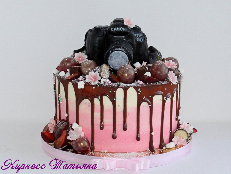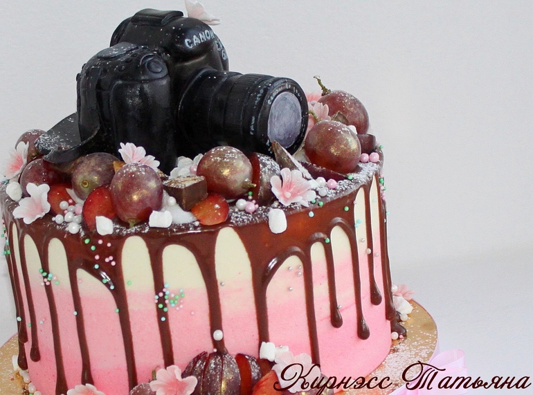 Украшение тортов кремом,шоколадом, фруктамиЭтот тортик заказали друзья девушки, увлекающейся фотографией. Внутри "Молочная девочка" со сливочно-сметанным кремом и вишенка в желе.