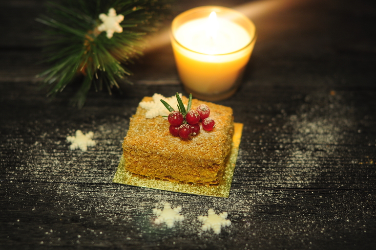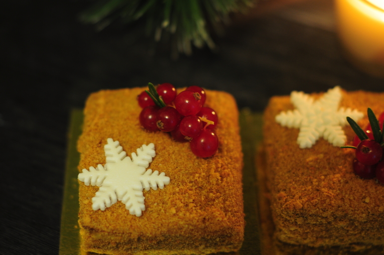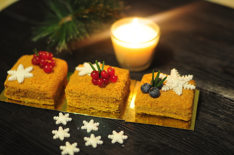 Украшение тортов кремом,шоколадом, фруктамиВ дополнение к новогоднему торту были заказаны еще и мини-тортики "Медовик". Было их немного, всего 7 шт :)