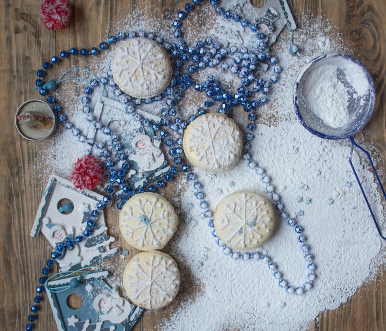 Миндальные с зимней тематикой, шоколадный ганаш на сливочном сыре