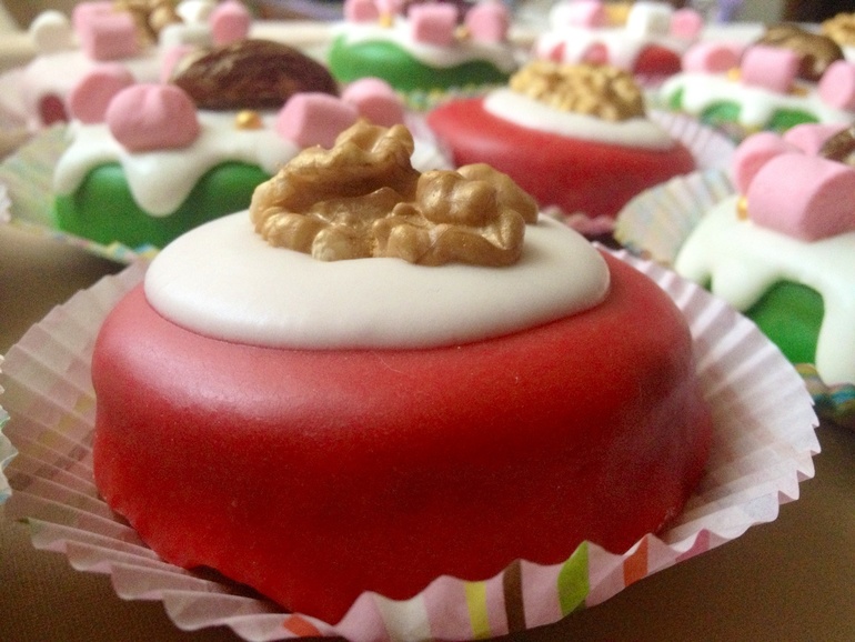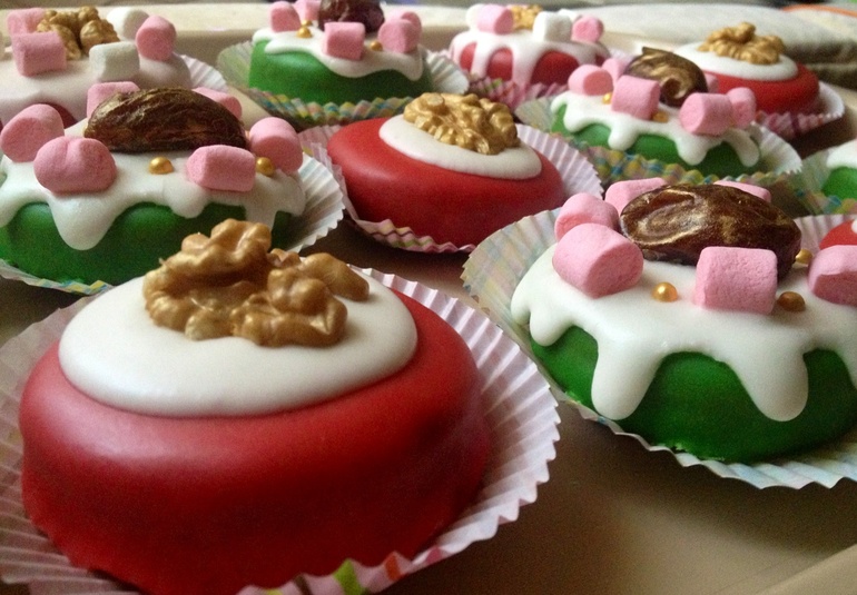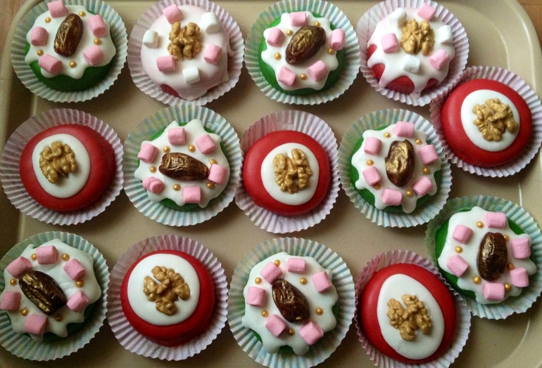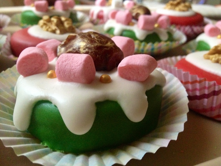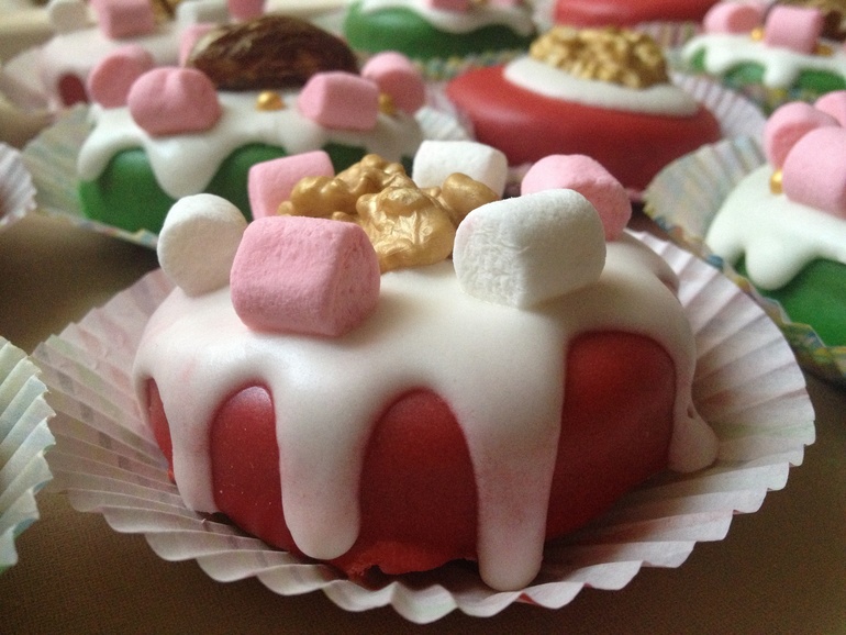Украшены глазурью на основе мандаринового сока и айсинга, малышками маршмэллоу, золотыми сахарными бусинками и позолоченным фиником, начинённым миндальным орешком: