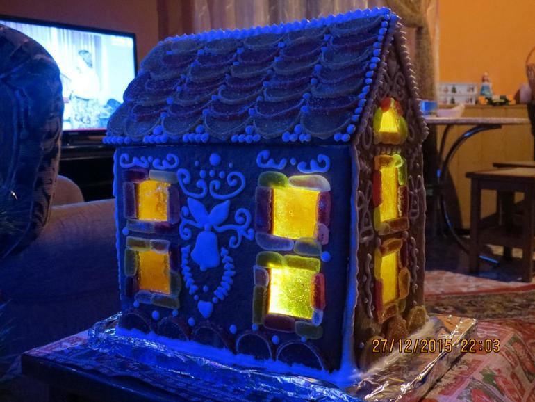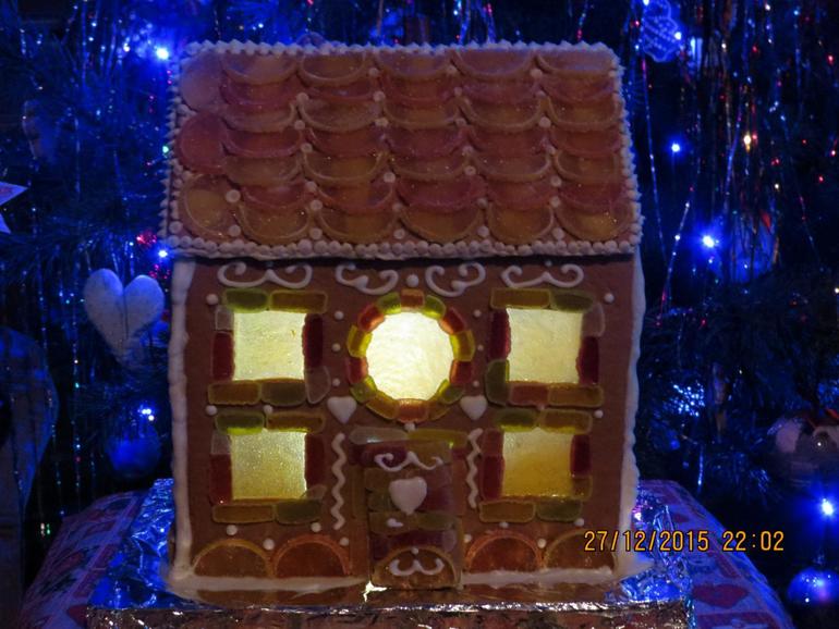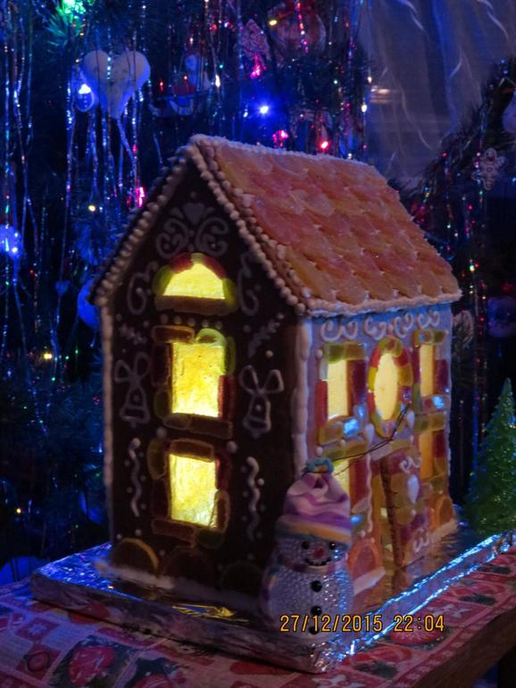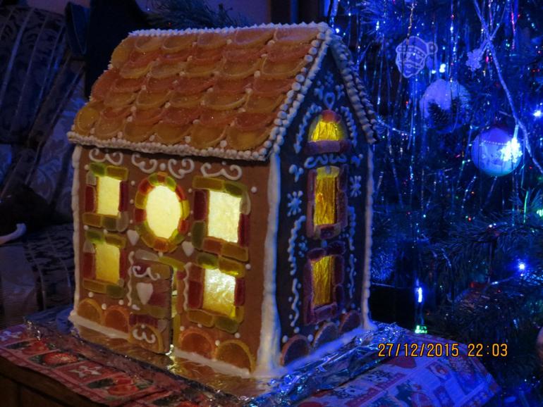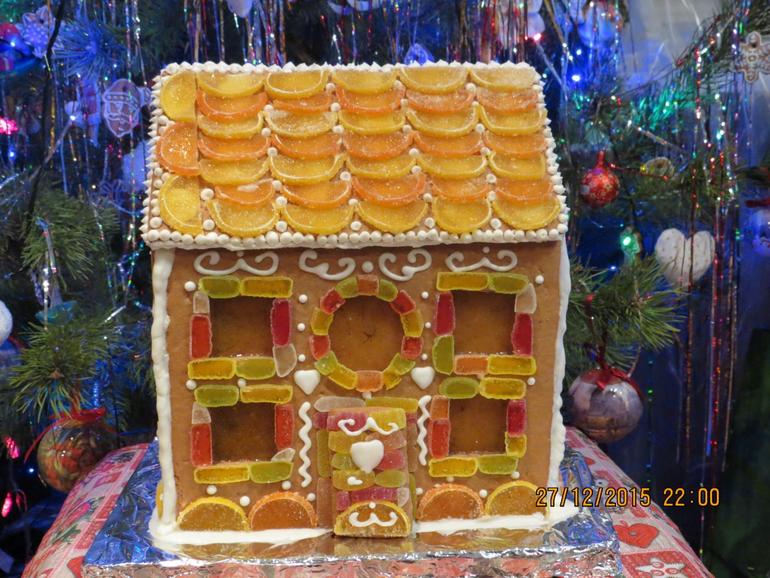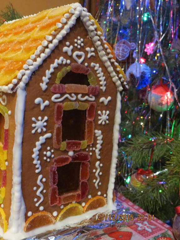 Я каждый НГ пеку домик и прянички) использовала много рецептов, но этот самый вкусный, моему сыночку очень понравился) Рецептик: 300 г жидкого меда; 4 яйца ; 250 г сахара; 2 ч л молотого имбиря; 2 ч л молотой корицы; 200 г сливочного масла; 750 г муки; ванилин; 2 ч л какао; 4 ч л разрыхлителя для теста; 2 ч л тертой апельсиновый цедры. Размягченное масло смешать с сахаром,медом и яйцами. Все Сухие компоненты смешать с мукой, замесить тесто и убрать в холодильник на 20-30 минут, затем раскатать тесто слоем 0,5-0,7 мм, выпекать до готовности 5-7 минут. Глазурь для склейки и украшения: 1 свежий белок куриного яйца; 250 г сахарной пудры; 1 ст л лимонного сока. Нужно вилкой взбить белок до легкой пены, затем постепенно добавляем сахарную пудру, в конце добавляем лимонный сок.