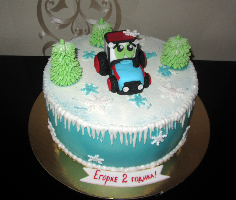 Торты детскиеИменно таким было пожелание мамы именинника) Хотели зиму, ёлки и трактор! 3 кг МД с клубникой и бананом, покрыт молочной мастикой. За выходные истратила все свои запасы))))