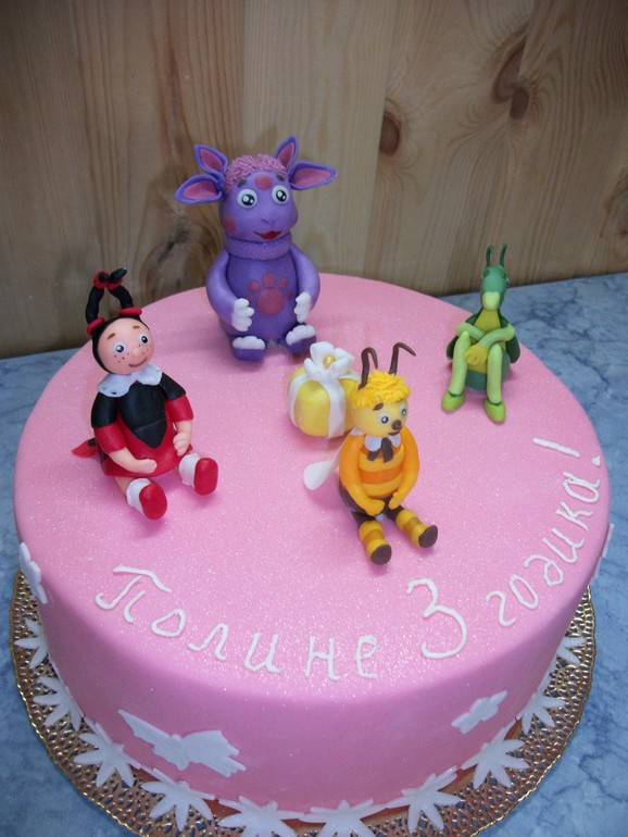 Лунтик и его компания хорошо слеплены, торт аккуратный! Видно, что Вы стараетесь, но надпись совсем не нравится. Не обижайтесь, сейчас много всего для надписей продаётся..