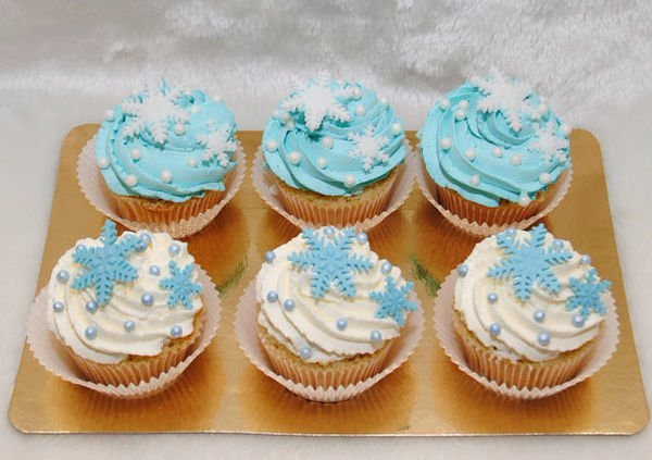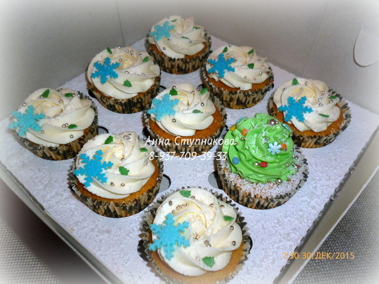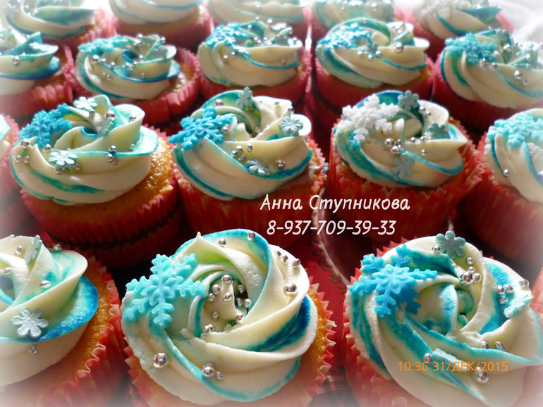 Детали декора чуть подсушть, а капы с кремом чтоб в холодильнике постояли и застыли. Я на застывшый крем укладывала подсохшие снежинки, все было ок, а вот когда сразу крем нанесла и сразу положила снежинки, они размокли и приняли форму шапочек)