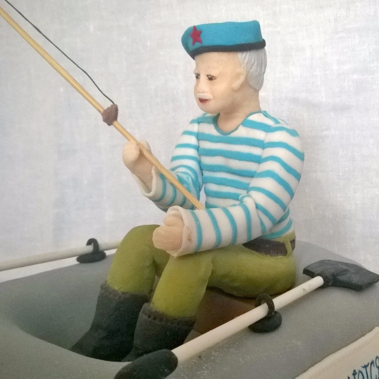 Обязательными атрибутами на торте должны были быть лодка, рыбак, тельняшка и кепка вдвшника, это и постаралась изобразить.