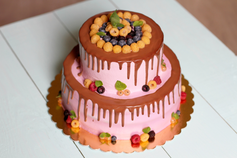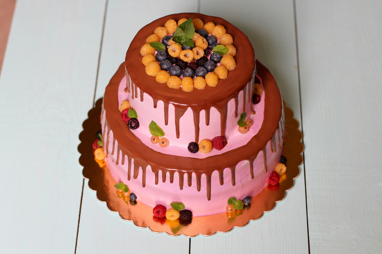 Украшение тортов кремом,шоколадом, фруктамиЭтот торт был вторым в моей практике двухъярусных тортов)