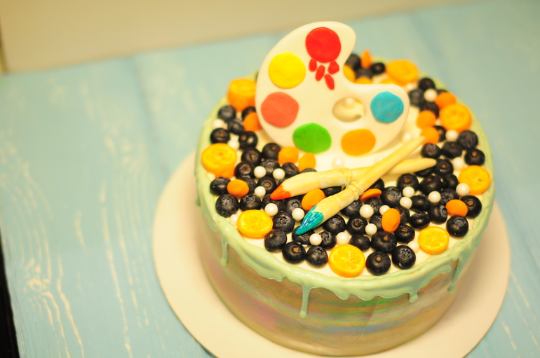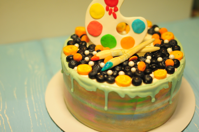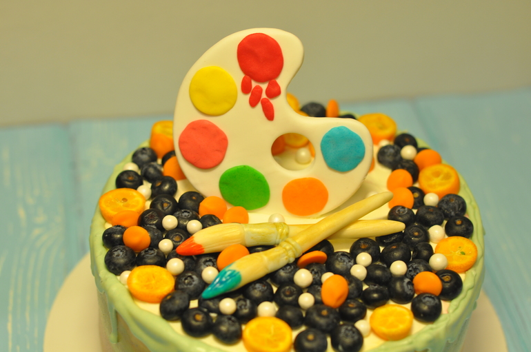 Украшение тортов кремом,шоколадом, фруктамиЯркий и красочный тортик для художника :)