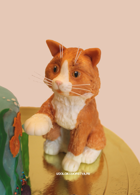 Ох, и намучалась я с ним.... то коту не могла придать хоть немного кошачьи формы, глазурь моя первая не захотела ровно покрыть торт (хотя до этого на пироженках потренировалась), как смогла прикрыла все неровности рыбками и водорослями ... ну хоть заказчица осталась довольна)))
