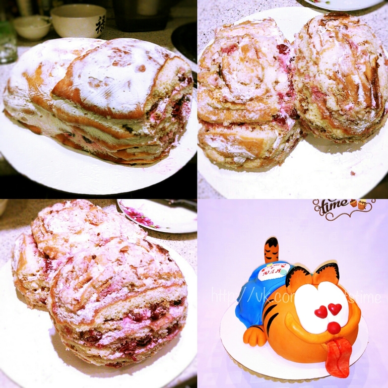 Тортик делала по образцу из интернета, автора увы не знаю, но торт не много переделала ,а именно мордочку. Это был первый раз когда я в себе усомнилась,не думала что у меня что то получиться,но вроде вышло нормально.)))) Только не много странным выглядет язык,переделывал его 100500 раз и никак не могла добиться того чего хотела. (((( Ну и шоколадные Капкейки с вишнёвым курдом и крем чизом. Критика приветствуется!))))