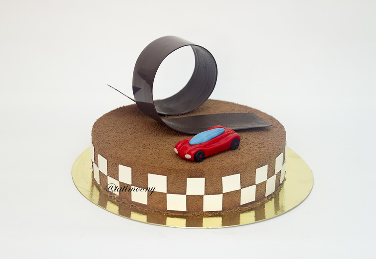 Внутри: миндальный бисквит, миндальный штройзель в белом шоколаде, клубничный мусс, клубничное конфи и фисташковый мусс.