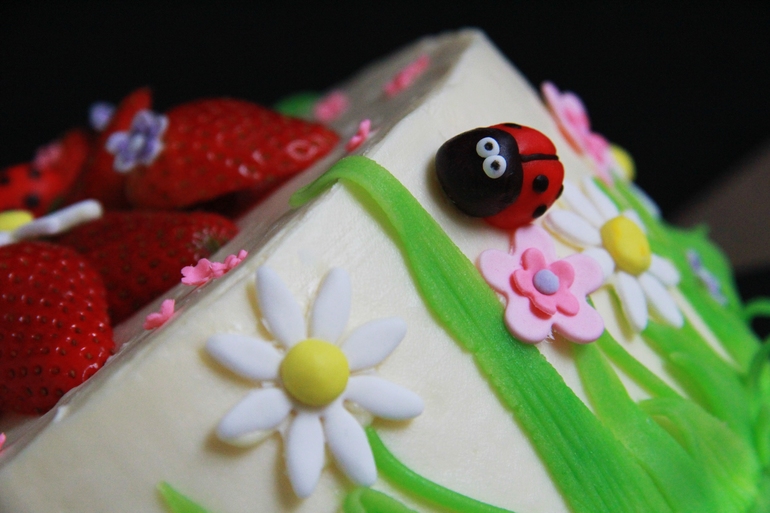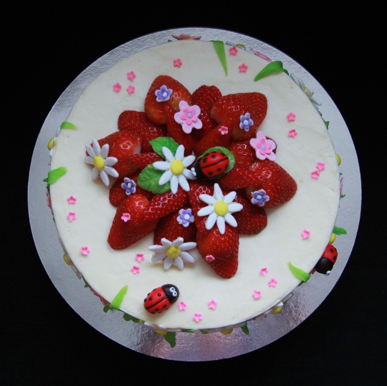 Тортик с божьими коровками и клубничкой) Ну чем не лето?)))) Внутри ванильные коржи, клубничное суфле. Больше под кат.