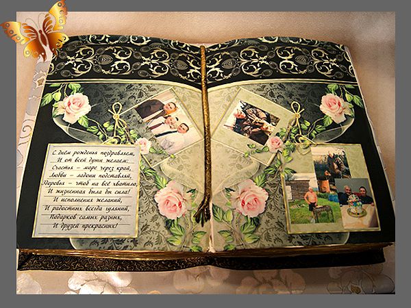 Галина, добрый вечер. спасибо :) Был такой Торт "Книга" Вес 5,5 кг Первый торт: Коржи - кофейно - медовые коржи. Крем - сливочный крем с домашней сгущёнкой. Начинка - малиновый конфитюр на белом шоколаде. Второй торт: Коржи - кофейно - медовые коржи. Крем - сливочный крем с домашней карамелью. Начинка - чернослив в горьком шоколаде. Декор - сливки, шоколадная мастика, вафельная бумага со съедобной печатью.