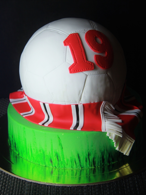 Ну вот мой третий, и как я всегда зарекаюсь, последний мастичный тортик))) Но ооочень просила знакомая для сына на его 19-летие сделать футбольный торт. Я с ним измучилась - сил нет! Ну не умею я обтягивать мастикой((( Пыталась пятиугольниками, ничего не получилось.... Обтянула кое-как. Знаю, что надо толще было раскатывать, но мне не хотелось. Итог - низ в складках. Ну и ладно, он же последний