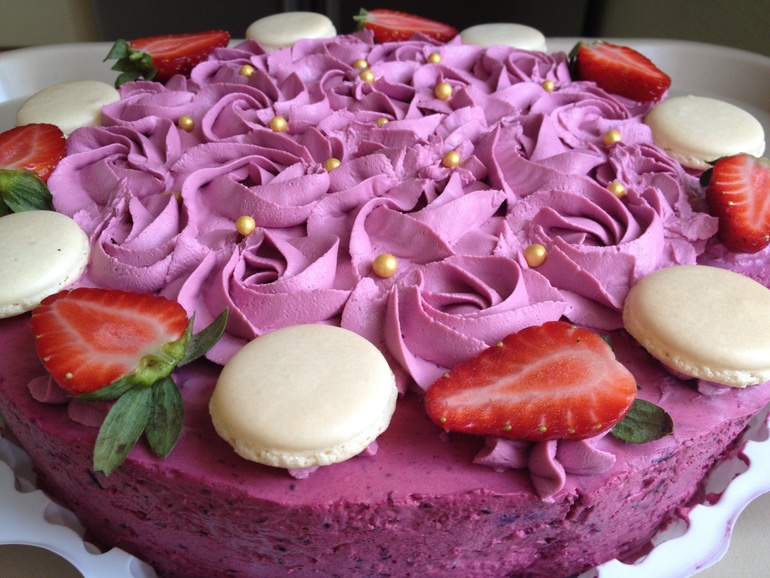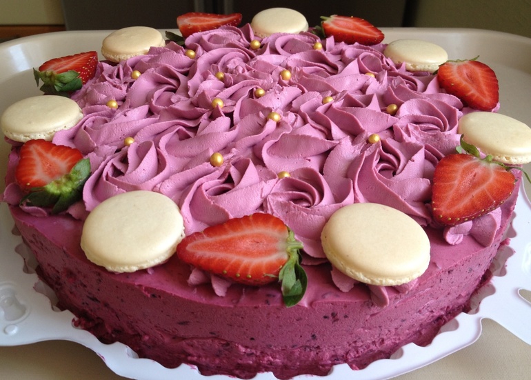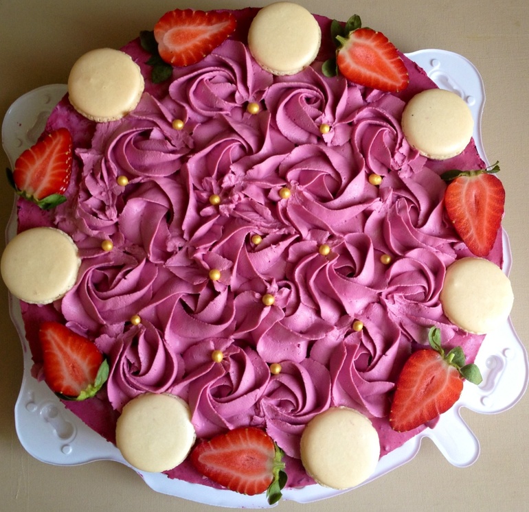 Сверху ароматный крем из сливочного сыра, свежая клубничка и макарон.