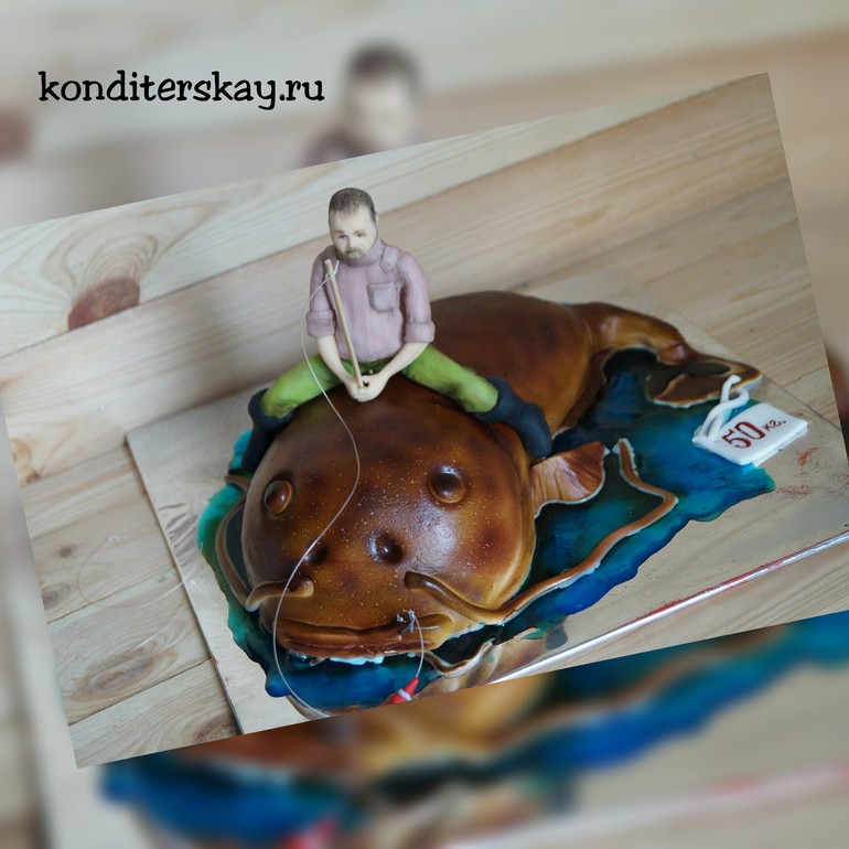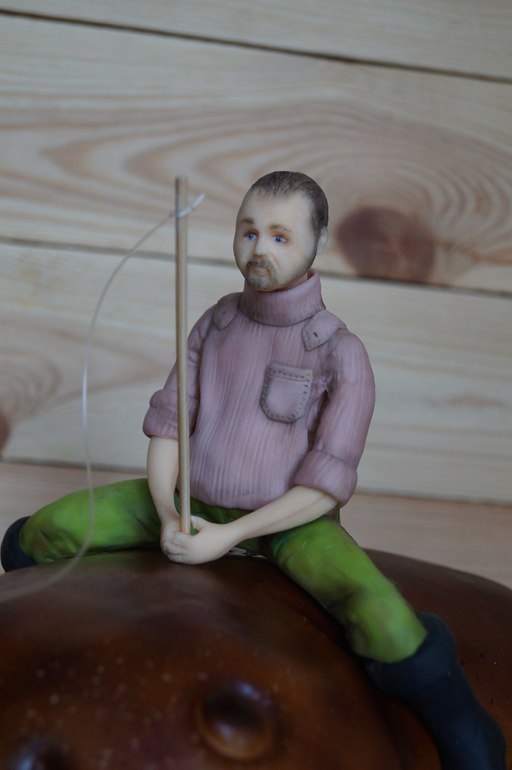 Тортик хороший. Не знаю похож или нет получился мужчина на прототип, но мне просто "глаз режет" не естественный цвет кожи, как-будто покойник на рыбе сидит, извините...(