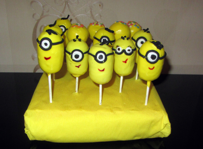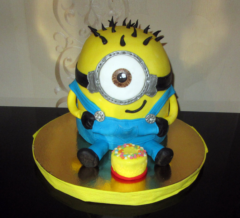 Торты детскиеТеперь у меня есть Миньон, давно хотела его сделать! Внутри две начинки, вес аж четыре кг! Еще пыталась сделать попсы в тему, фото под катом. Что-то никак они у меня не удаются( то с палочек падают, то глазурь не ровно ложится((( А еще не сообразила как Миньончикам штаны одеть)))