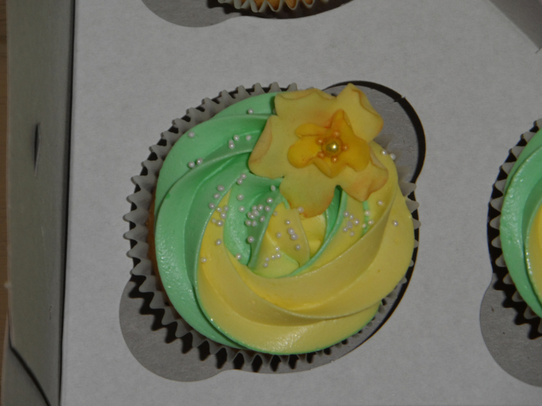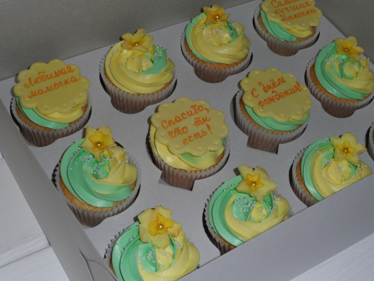 Ванильные капкейки, с начинкой ассорти: солёная карамель, ягодное конфи, лимонный курд, кремовая шапочка.