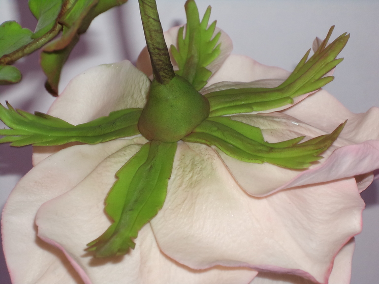 Обратите внимание как у розы растут листики (зеленые), у них нет черенков. На фото хорошо видно. Вы не сфотографировали вашу розу снизу, поэтому не видно, что там. Но когда делаешь зеленые чашелистики, зеленой бульбочкой (на знаю как называется, все это крутящееся дело придавливаешь). Потом не крутится.