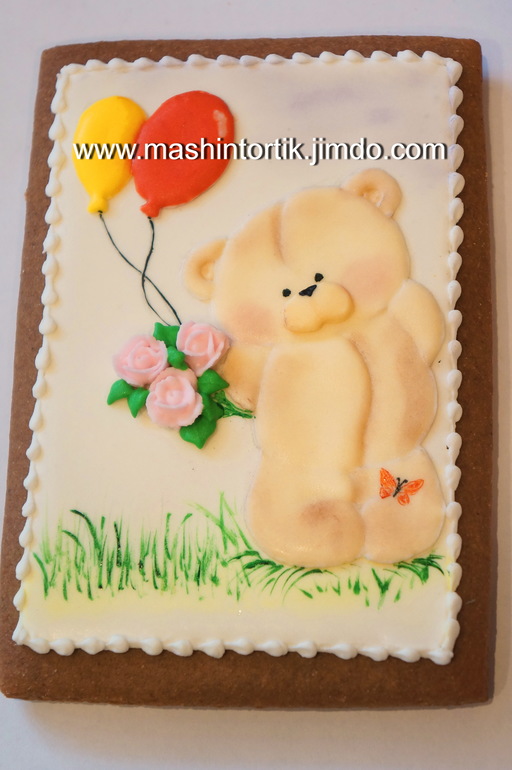 Это старая английская техника создания объемных фигур, как здесь мишка, барельефов, камеи так тоже делают.. Есть пайпинг гель спец, его замешивают в айсинг, но, наверное, и без него можно ;)