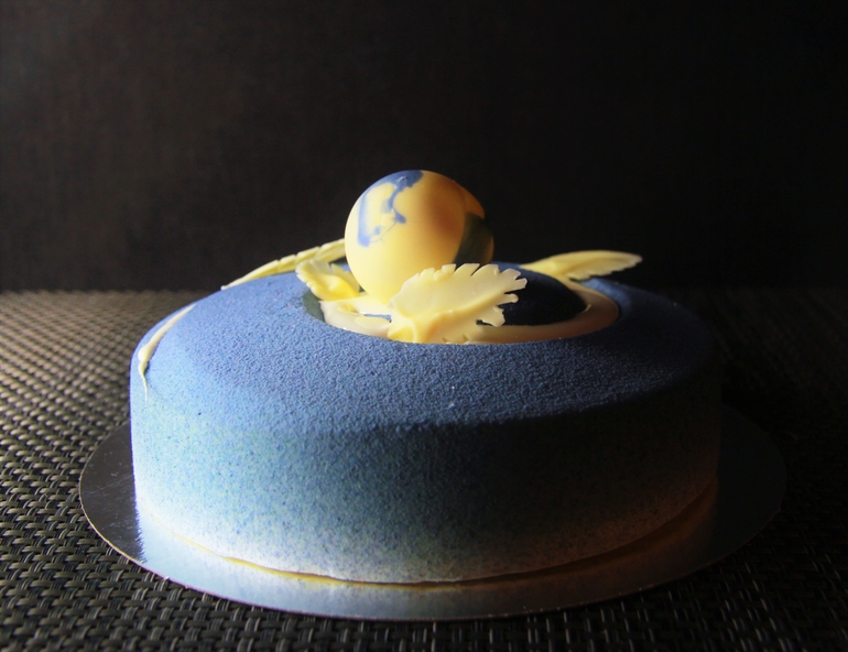 Первый тортик белый. В составе черемуховый бисквит, хрустящая прослойка из белого шоколада, миндаля и вафельной крошки, черничный мусс, черничное конфи и мусс кремчиз.