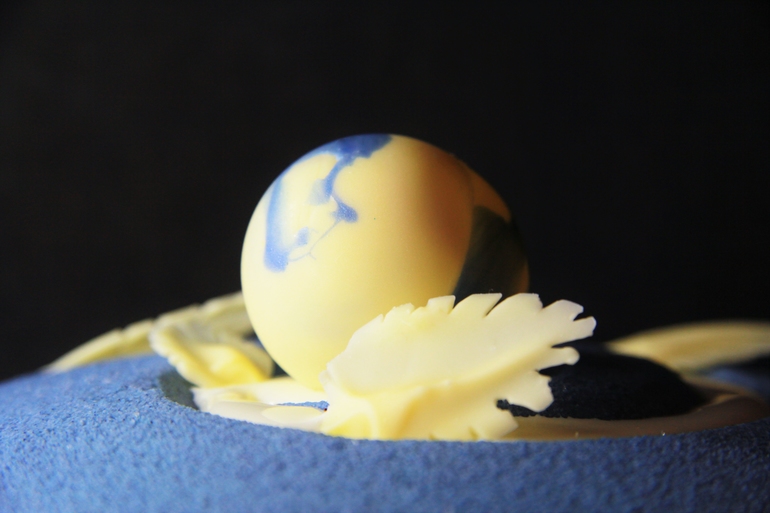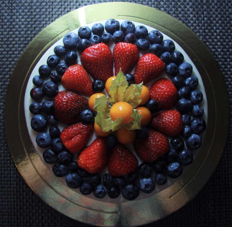 Миндальный бисквит, мусс из черной смородины, мусс кремчиз. Планировался шоколадный цветок, но муж его разбил((( Поэтому сфера. Хорошо, что тортик в подарок и декор там без разницы)