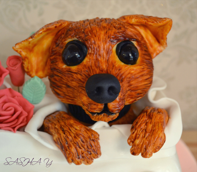 к сожалению, не хватает реалистичности в этом торте, у роз торчат проволоки, листья не проработаны, собака тоже, колбаски у сумки не ровные.. такие торты требуют определенного уровня, который в этой работе не выдержан, увы ;(