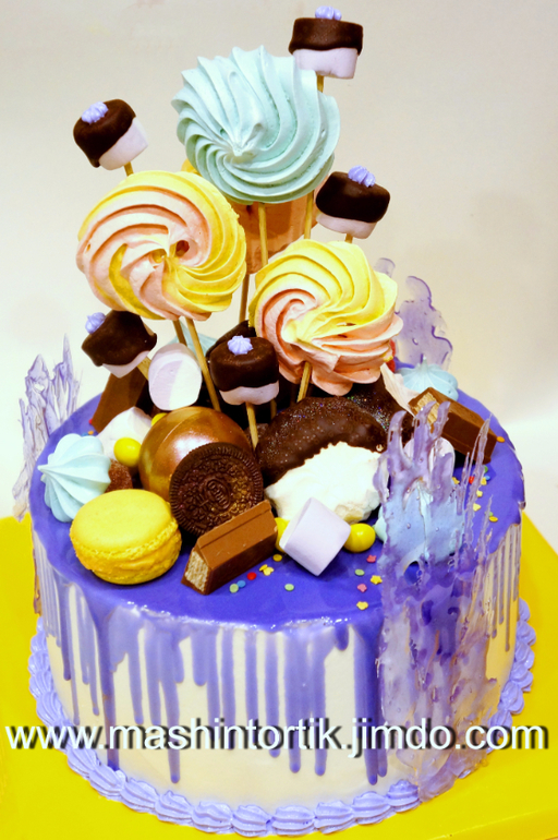 Украшение тортов кремом,шоколадом, фруктамиЮленька, спасибо за дизайн :)) итак, вот и у меня тортик взорвался конфетками :)) вес 4,3 кг, внутри молочная девочка с клубникой, снаружи крим чиз. тортик для нашей ББ-шечки Ольги и ее доченек :) Под кат попсики и меренга