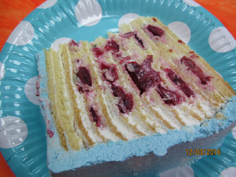 Внутри сметанник (две порции) с вишней и сливочным кремом. Планировалось крем сделать сливки+сметана , но сливки так взбились хорошо, что их оказалось достаточно на весь торт и еще осталось.
