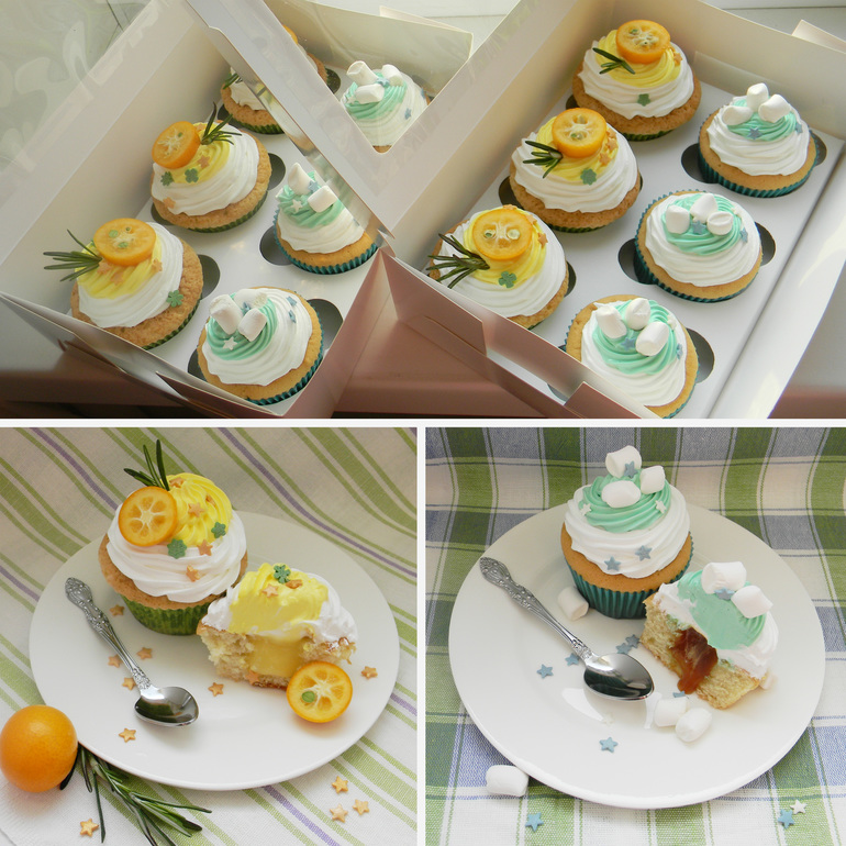 Лимонные с лимонным курдом и ванильные с карамелью, шапочки из мокрого безе.