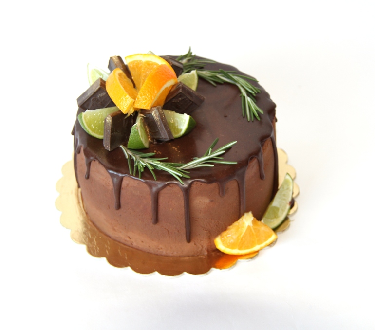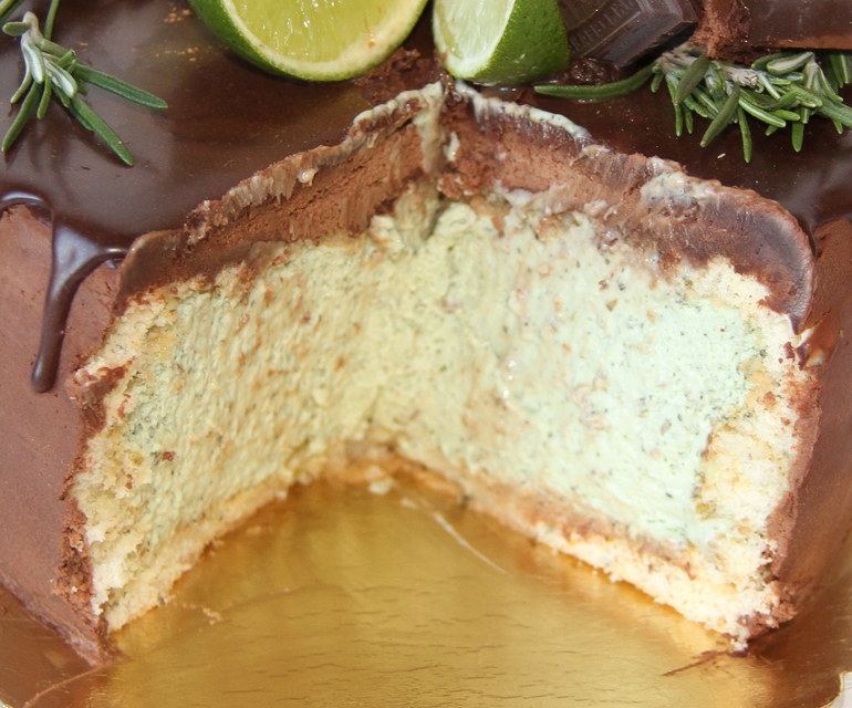 Состав: лаймово-мятный бисквит с лаймово-ромовой пропиткой, лаймовый мусс, ганаш на темном шоколаде.