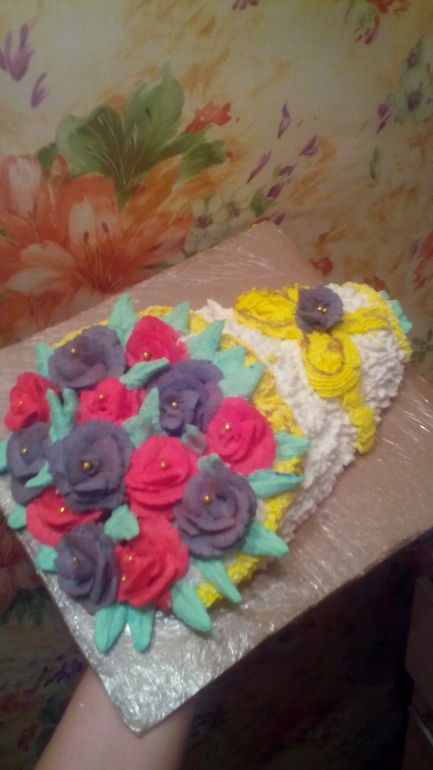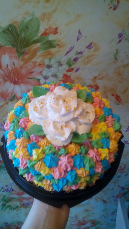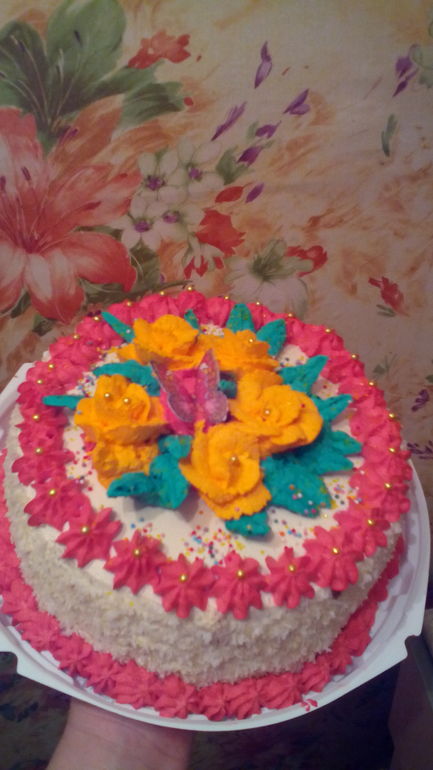 Маша много замечаний написала, все по делу! От себя добавлю, выравнивайте торт кремом на основе масла, любым, им легче ровнять, на хорошо выровненный торт не нужно слишком много кремового декора и он смотрится аккуратно. Для цветов тоже нужно использовать другой крем, начните с мокрого безе, делать его легко, красить можно в более сдержанные цвета, с цветом у вас перебор и форму он отлично держит, позже можно будет на масляные перейти, с ними нужен опыт чтобы работать. Стремитесь к аккуратности в работе, преобретите подложки готовые. В сообществе очень много кремовых тортов, пересмотрите, ровняйтесь на на них, стремитесь, уделяйте внимание мелочам. Дальнейшим Вам успехов!