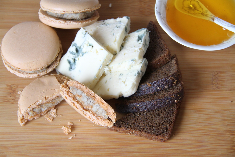 Макаронс с голубым сыром, медом и бородинским хлебом.