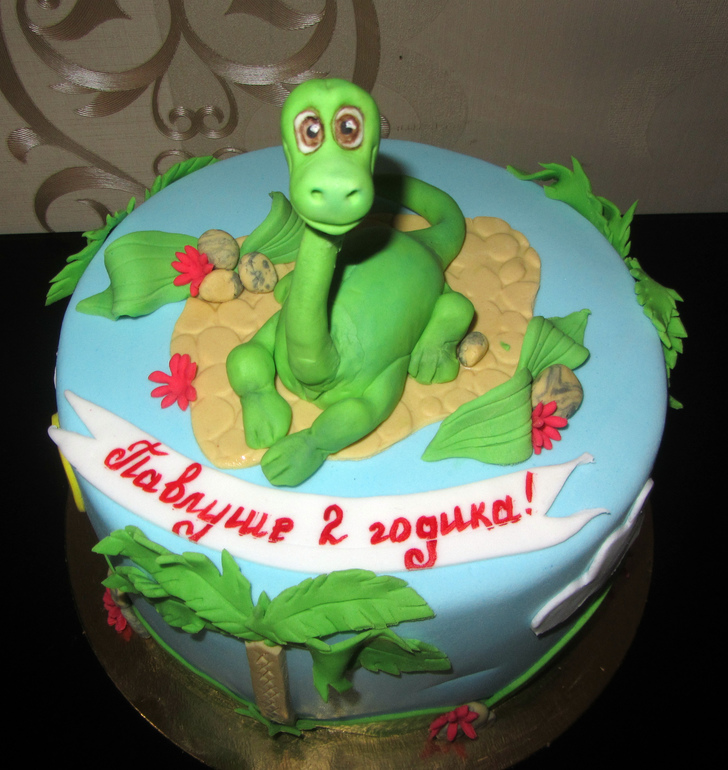 Торты детскиеЯркий торт для маленького Павлика, большого поклонника зеленого, длинношеего динозавра)