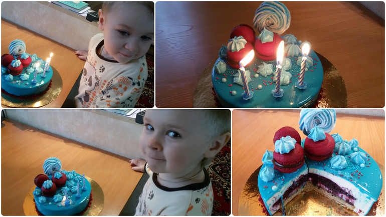 Делала сыну на день рождения. В понедельник начали утро с тортика))).