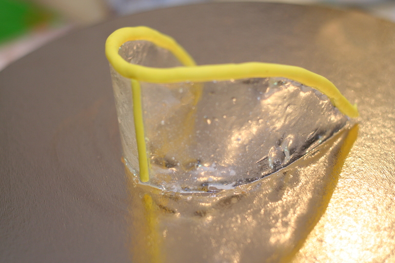 Элеоноре СК за мастер-класс. Его я взяла за основу. Но с фольгой не срослось сразу, т.к. стекло выходило не гладким и местами она была зажата в тисках застывшей карамели. Потом оказалось, что моя гибкая доска не выдерживает высоких температур, начинает вздуваться и искажает форму. И вообще, оказывается двух рук мало, т.к. ими я удерживала коврик под нужным углом, и где то нужно было срочно найти третью руку, отковыривающую застывший изомальт от основы. Пришлось отказаться от изначального подхода и изобретать что-то новое. Вот такая конструкция в конечном итоге помогла мне достигнуть желаемого результата: