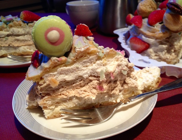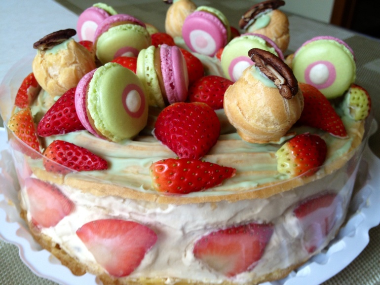 Такой французский торт. Заварное и слоеное тесто. Крем сливки-сыр, ликер, кофе, орешки "Пекан". Украшен макарон, клубникой и миниатюрными профитрольками.
