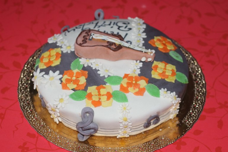 Торты для домашних и друзейСделала тортик для девушки друга. Просил музыкальное направление и с цветами. Гитара к сожалению не получилась. Тортики только учусь делать, так что набиваю руку)
