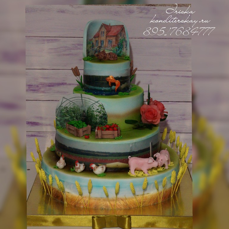 Торты корпоративныеЯ его победила !!!! Ура !!! Ох и нервов он мне потрепал !!! Долго обсуждался заказ, накидала кучу вариантов дизайна из инета ( задача была такой : поле пшеницы, куры , свиньи, теплицы ,огурцы, помидоры , розы, пруд , дом, семья). В этом малыше вот прям буквально " Все и сразу" . Не один вариант заказчиков не устроил , села нарисовала эскиз, как вижу это я - одобрили ( Ура !!!!) . И понеслось дважды переносили дату, затем заказчики решили добавить четвёртый ярус. В общем голова шла кругом . Чем ближе была дата исполнения заказа , тем больше я сомневалась в дизайне торта . В итоге вышло 12 кг . Внутри черепаха со сливочно- сметанным кремом . Размеры ярусов : 36\28\18\11.