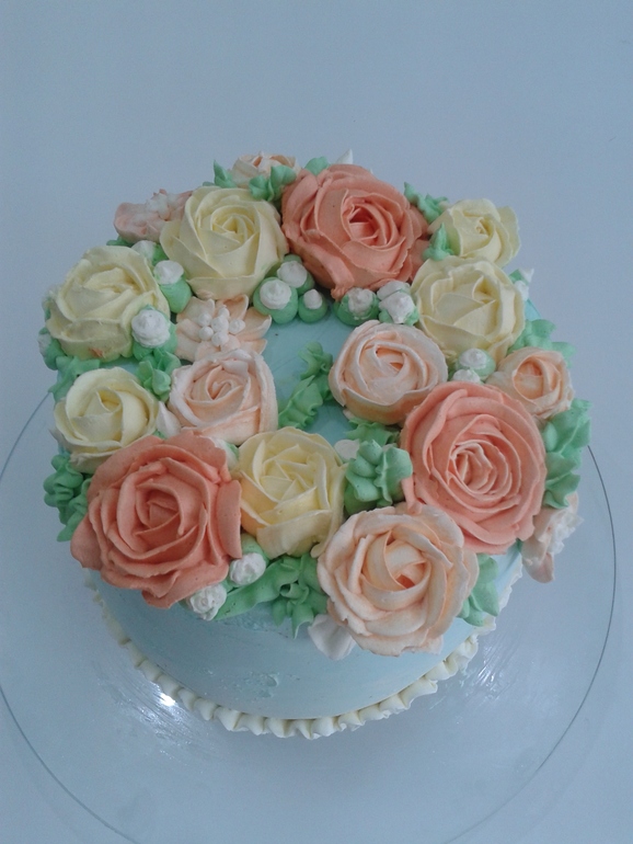 Смотрю на него, и мне так же смешно как и вам))) даже не пыталась его нормально выровнять, очень хотелось начать отсаживать розы) цветовое сочетание-вообще песня, не ругайтесь, я исправлюсь) ну и конечно же листья) вот прям как в магазинном киевском торте) и много так-не пожалела) да я вообще ни на что не поскупилась в этом торте))) ииии-тадам!!! Что вышло-то вышло, краснеть за него не придется-делала для себя)
