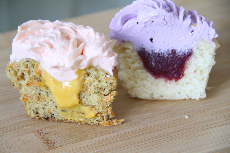 Капкейки морковные с манго и сырной "шапочкой" и ванильные с ягодным курдом.