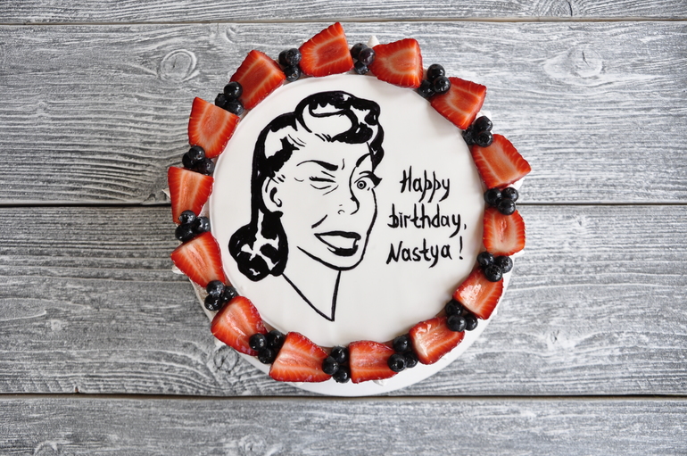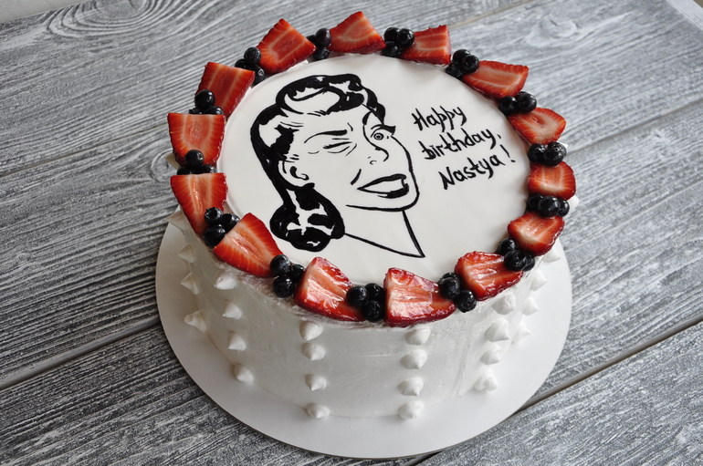 Украшение тортов кремом,шоколадом, фруктамиОчень просили меня нарисовать на торте девушку, получилось как то так, что- то не то со ртом)) Хочу спросить про белково-заварной, как им выравнивать торт? Он такой тугой и вообще( у меня это плохо получается после кремчиза. Может есть секреты? Поделитесь?