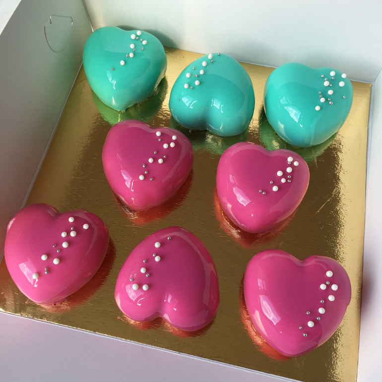 И вот такие пироженки. Внутри шоколадный бисквит, сырный мусс и малиновое конфи