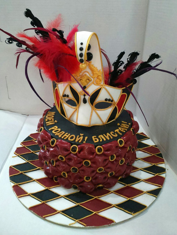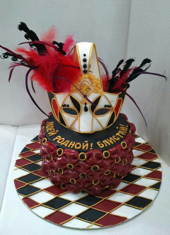 Торты тематическиеДизайн заказчицы.Маска из пастилажа в сочетании с Принцессой и Визьеном,изомальтовые камушки,перья настоящие.