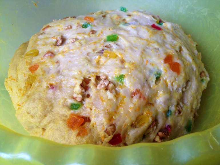 В этом году рецепт теста я взяла свой фирменный, но добавила вместо изюма или кураги - цукаты, а еще орехов грецких: