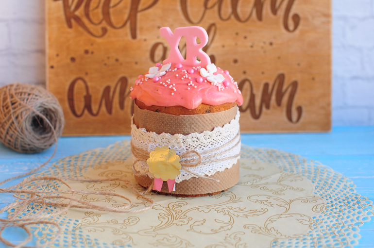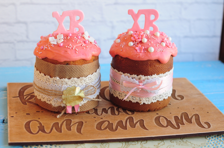 Печенье,пирожные,конфеты, выпечкаВот такие пасхальные куличи разъедутся сегодня к своим обладателям :) Все хотели клубничную глазурь, поэтому вот такие розовые все))) И оформлены в едином стиле)