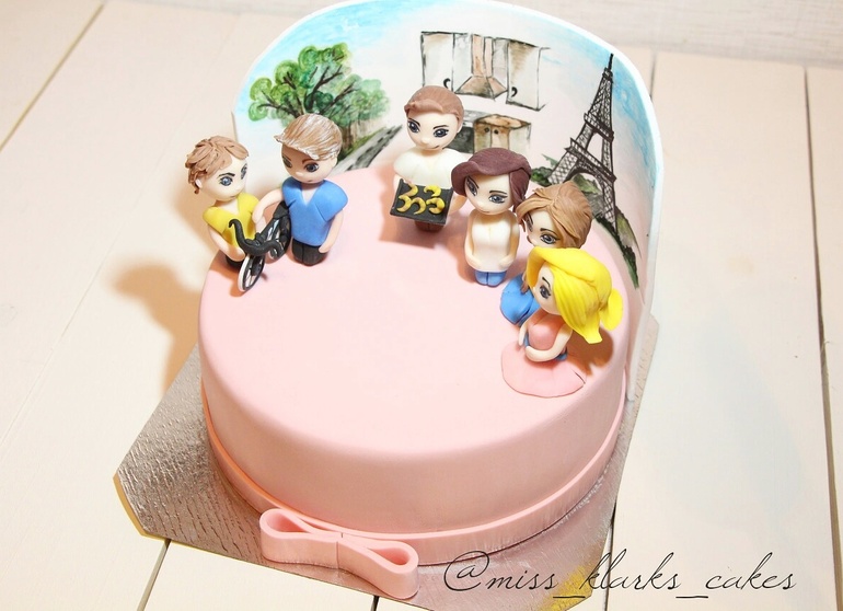 Заказчица сбросила фото своей семьи, на одном их них она с сестрой и мамой были в Париже. Папу нужно было изобразить на кухне, так как он любит готовить. А ее сына с дедушкой, который учит его водить велосипед😰 и все это на маленьком торте, не больше 1500 гр., который сегодня поедет аж в г. Орел. То есть, задача еще стояла сделать торт таким, чтобы он выдержал 5ти часовую транспортировку😰😰😰