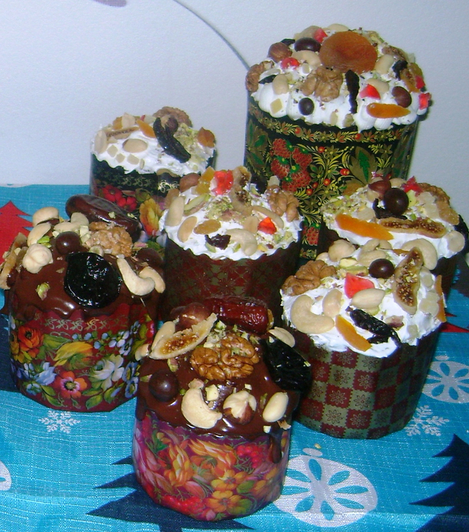 Яйца взбить с сахаром, ванилином, солью. Молоко подогреть до 50 градусов, добавить дрожжи, растворить, все смешать, добавит мягкое масло, цедру, муку. Поставить в теплое место. Два раза опускать. Третий добавить изюм и курагу, перемешать. поднимется, разложить по формам, поставит подниматься. Выпекать при 180С. Проверять деревянной шпажкой, если сверху румяные, а внутри еще не до конца пропеклись, положить сверху пергамент или бумагу. Украшение-курага, инжир, фисташки, грецкий орех, фундук, арахис и т.д.