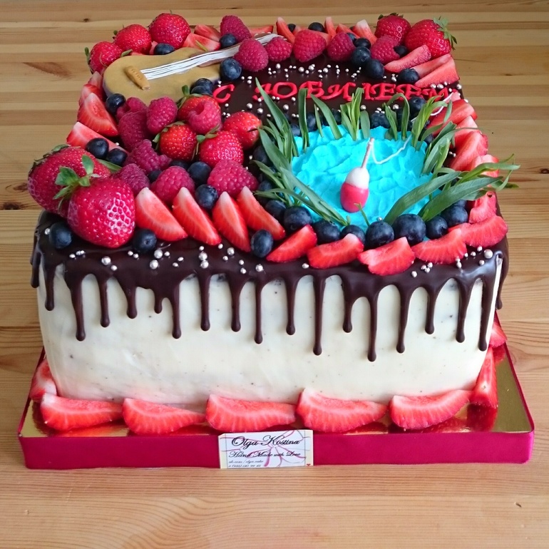 Украшение тортов кремом,шоколадом, фруктамиТорт для любимого свекра, увлечением которого является игра на гитаре и рыбалка.