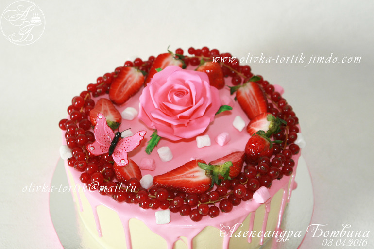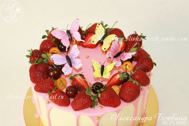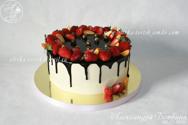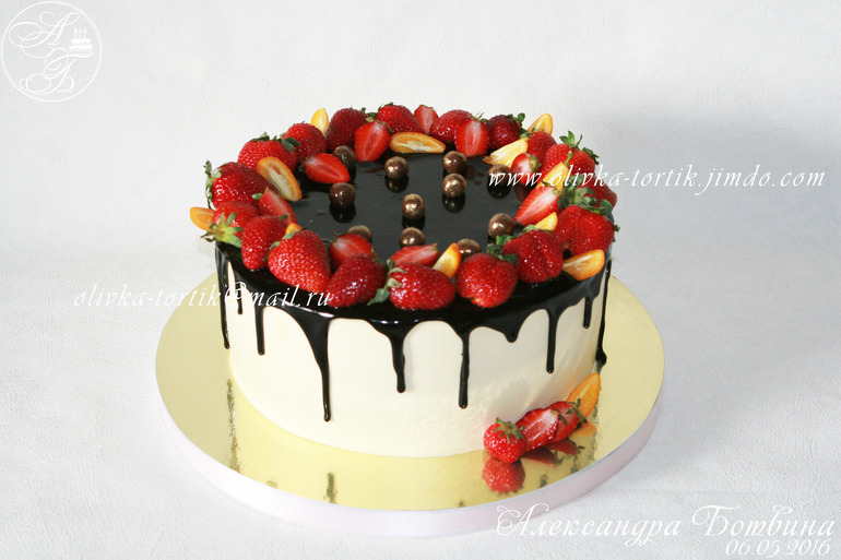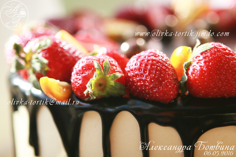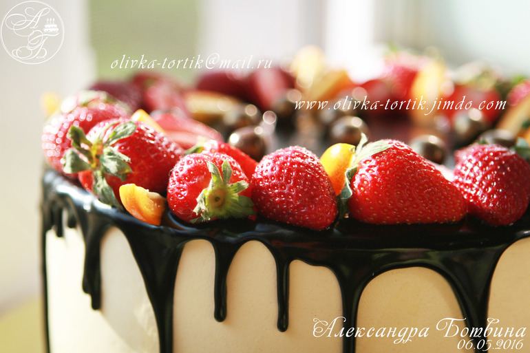Украшение тортов кремом,шоколадом, фруктамиВанильно-шифоновый бисквит. Творожно-сливочный крем,вишня.